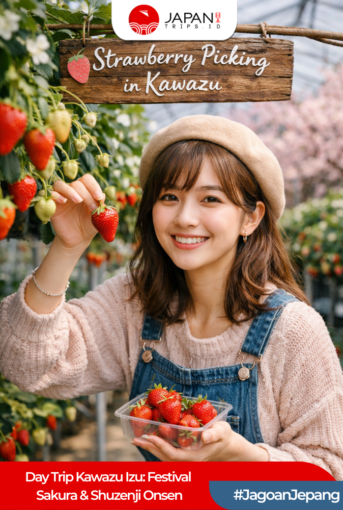 Festival Sakura Kawazu terkenal sebagai salah satu sakura yang mekar paling awal di Jepang, bahkan lebih cepat dibanding Tokyo. Bunga sakura pink lembut bermekaran sepanjang sungai, membuatnya menjadi spot terbaik untuk foto-foto dan menikmati suasana musim semi. Kunjungi kebun stroberi di Izu dan petik stroberi segar musiman langsung dari kebunnya. Rasanya manis, juicy, dan cocok untuk semua usia.