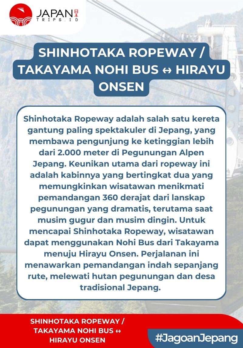 E-Ticket Shinhotaka Ropeway dan layanan Nohi Bus menawarkan kemudahan perjalanan antara destinasi utama di wilayah Gifu, termasuk antara Takayama dan Hirayu Onsen, serta perjalanan menuju Shin-Hotaka Ropeway, salah satu jalur kereta gantung yang terkenal di Jepang, yang menawarkan pemandangan spektakuler dari pegunungan Jepang yang menakjubkan.