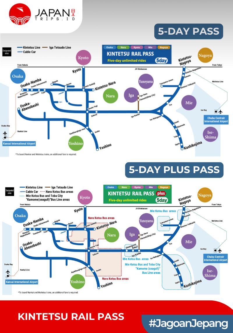 => Pass ini mencakup perjalanan tanpa batas dengan kereta Kintetsu, termasuk kereta ekspres dan lokal, serta beberapa bus yang terhubung dengan jalur Kintetsu di kawasan Kansai.
