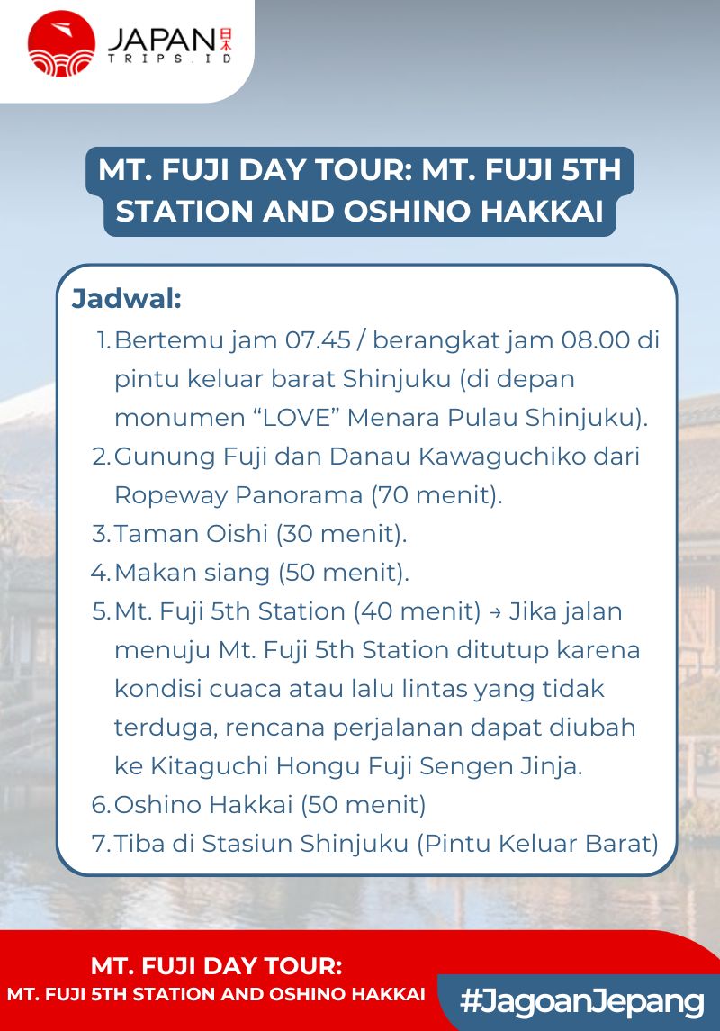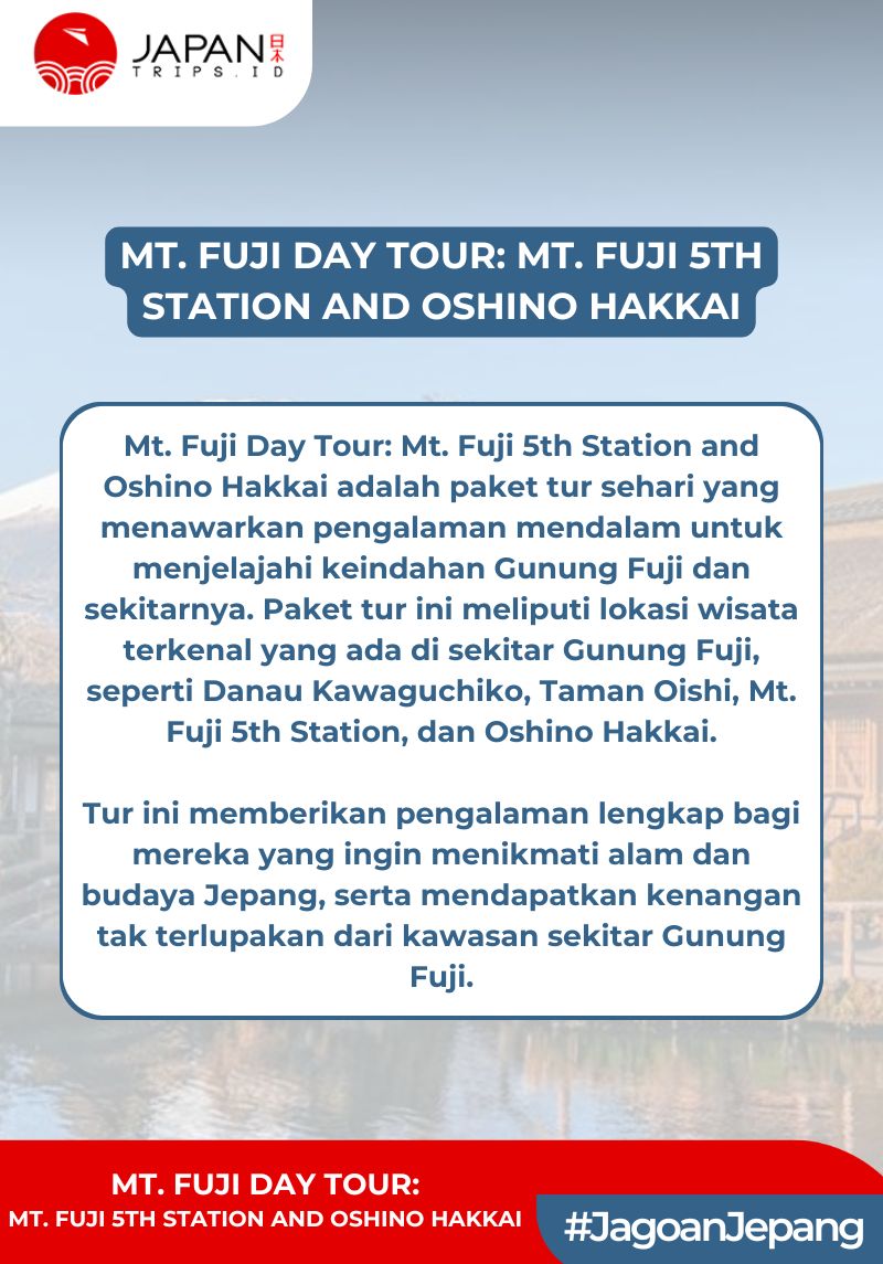Mt. Fuji Day Tour memberikan pengalaman wisata yang luar biasa dengan mengunjungi dua tempat ikonik di sekitar Gunung Fuji, yaitu Mt. Fuji 5th Station dan Oshino Hakkai. Pengunjung akan dibawa ke Mt. Fuji 5th Station, titik tertinggi yang dapat dicapai dengan kendaraan, di mana mereka dapat merasakan udara segar pegunungan dan pemandangan alam yang menakjubkan.